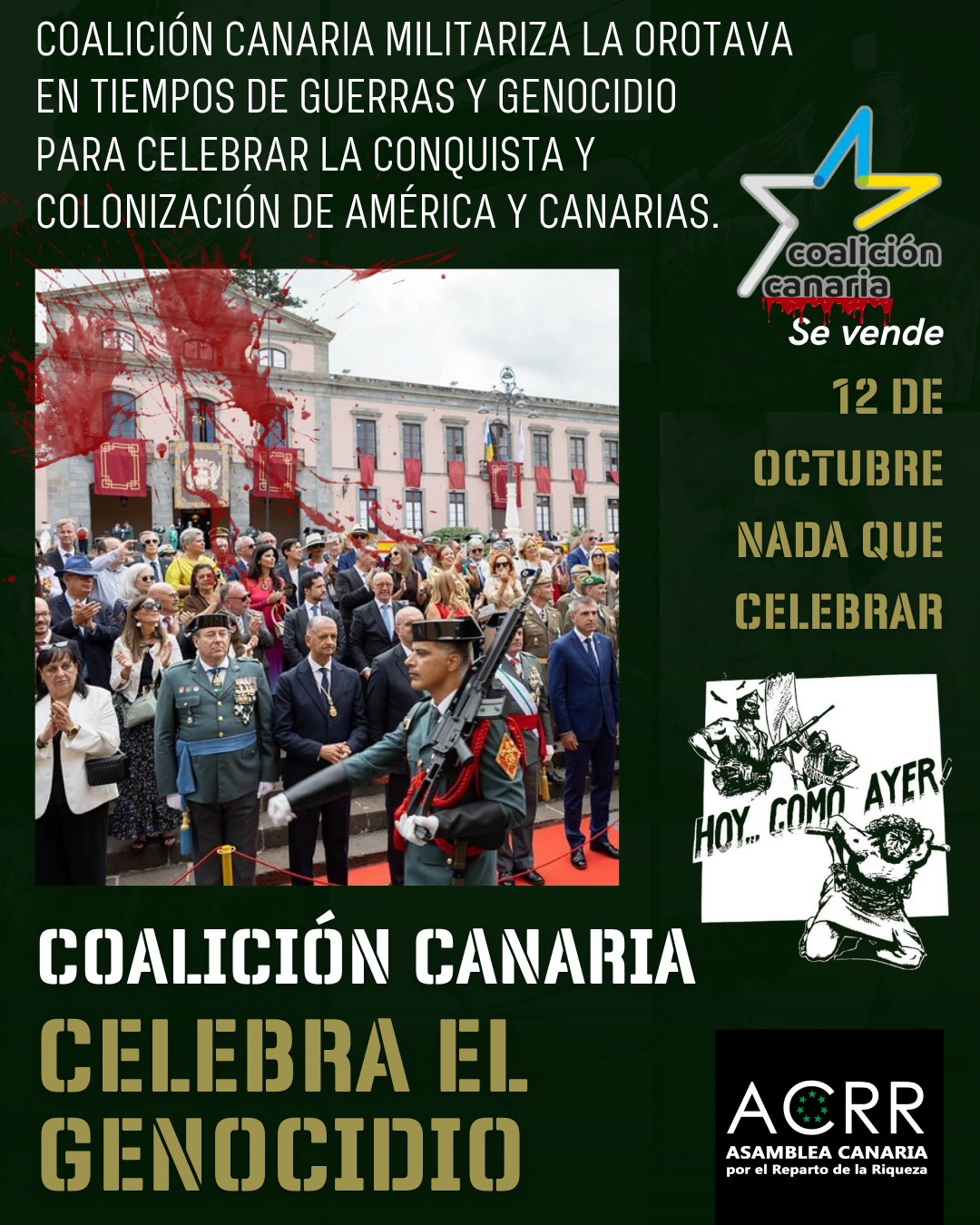La Orotava, que consiguió ser el primer municipio antimilitarista del estado español gracias a la movilización social y cuyo acuerdo fue revocado por propuesta y campaña del PSOE, celebró ayer con el beneplácito y la participación activa de Coalición Canaria y del alcalde Francisco Linares y la corporación local el día de la guardia civil en Canarias y la conmemoración del colonialismo y la sangrientas conquistas llevadas a cabo en las colonias españolas latinoamericanas y en Canarias, entre otros territorios.